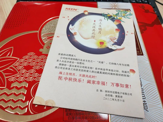 在2022年中秋佳節(jié)來(lái)臨之際,為感謝員工的辛勤付出,提前營(yíng)造溫馨、和諧的節(jié)日氛圍,邁騰電子及各地區(qū)子公司、分公司給全體員工發(fā)放中秋月餅福利,為員工及其家屬送上佳節(jié)的問(wèn)候和美好的節(jié)日祝福。